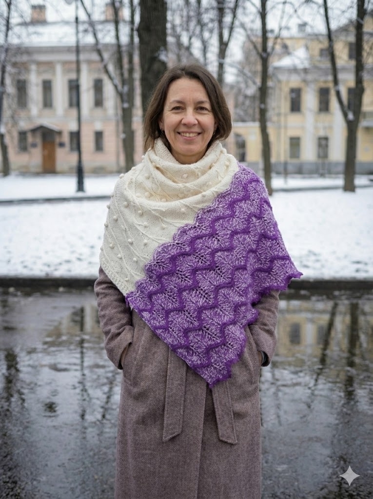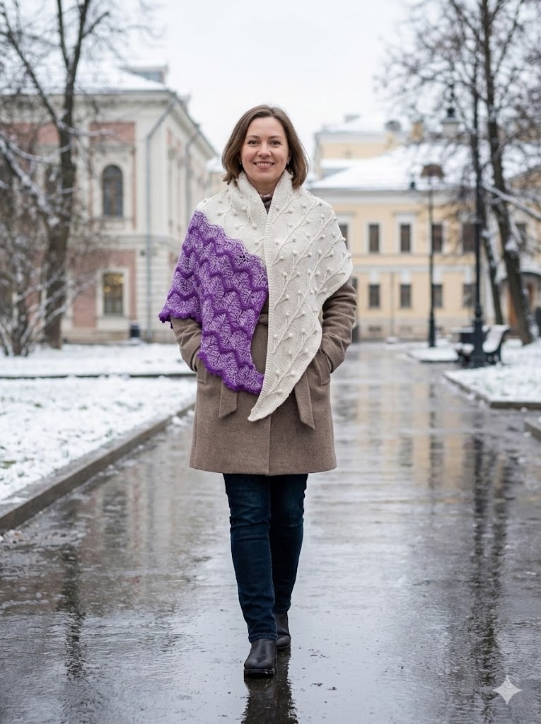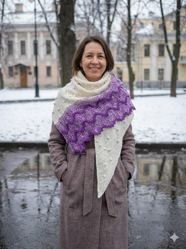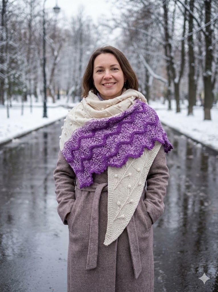 Асимметричная треугольная форма (бактус) позволяет драпировать шаль множеством способов: плотно обернуть вокруг шеи для тепла, оставить длинный ажурный угол свободно спадать на груди или накинуть на одно плечо, демонстрируя красоту перехода узоров.