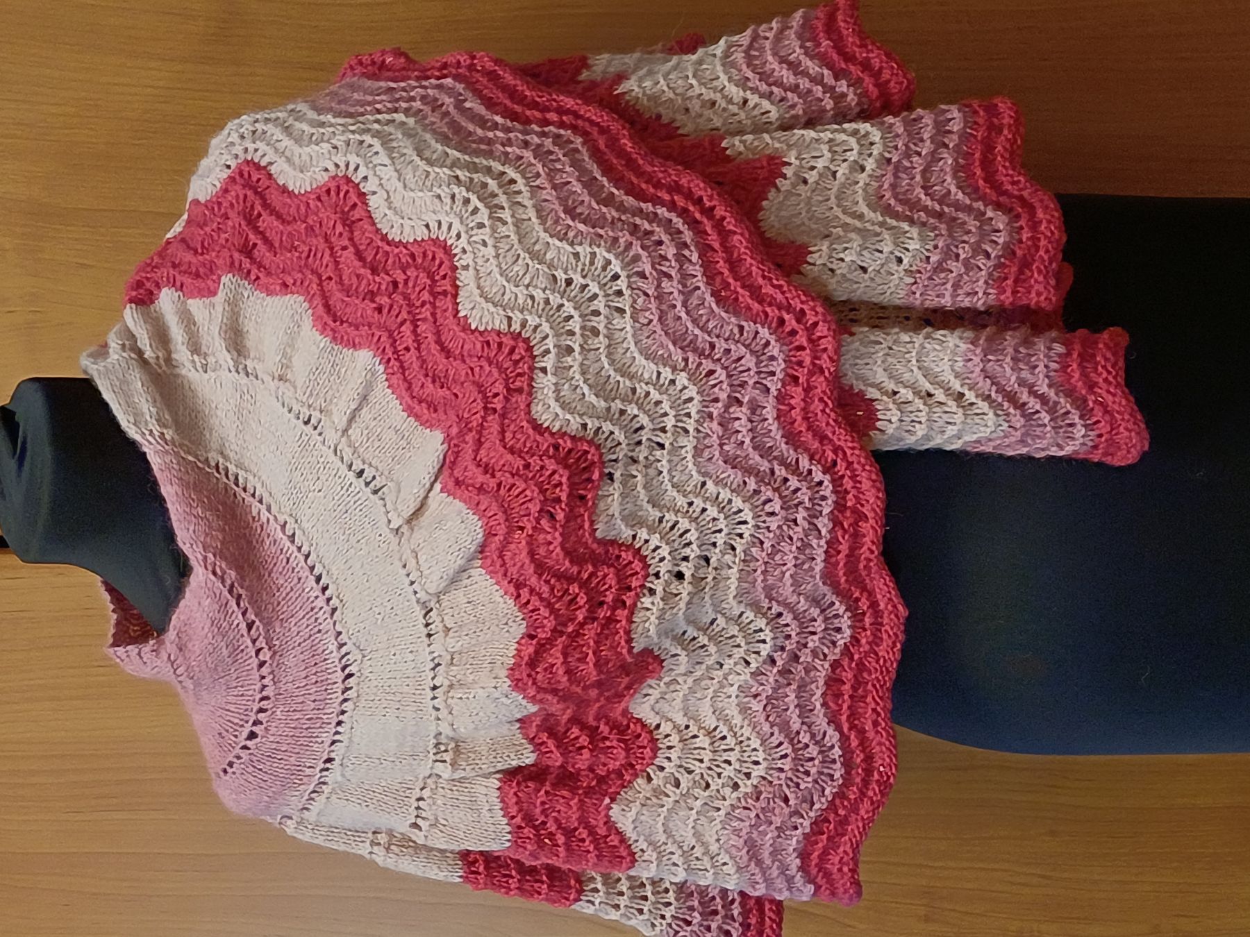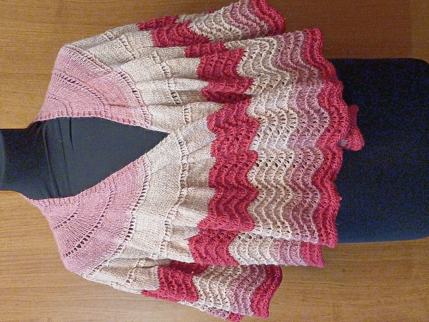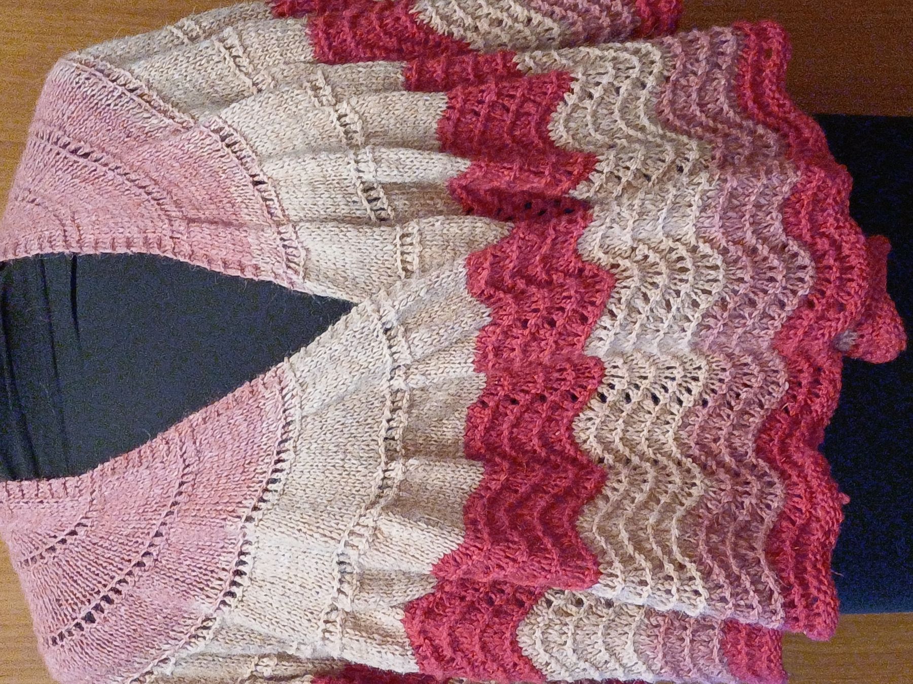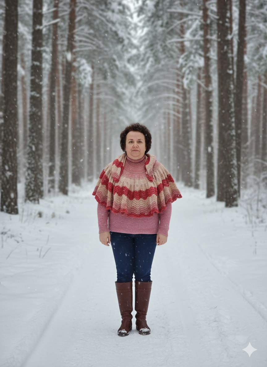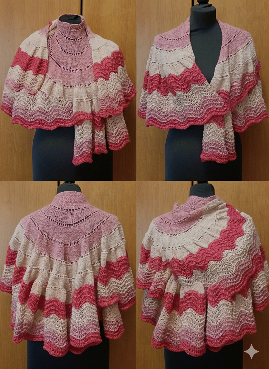 Эффектная накидка из 100% шерсти с уникальным волновым (зигзаг) узором. Градиентные переходы из бежевого в насыщенный розовый создают яркий и запоминающийся акцент. Модель универсальна: можно носить как элегантное болеро или тёплый шарф-пончо. Незаменимая вещь для тех, кто ценит комфорт, качество и стиль.Идеально дополнит свитер или водолазку. Прекрасный подарок себе или близким.