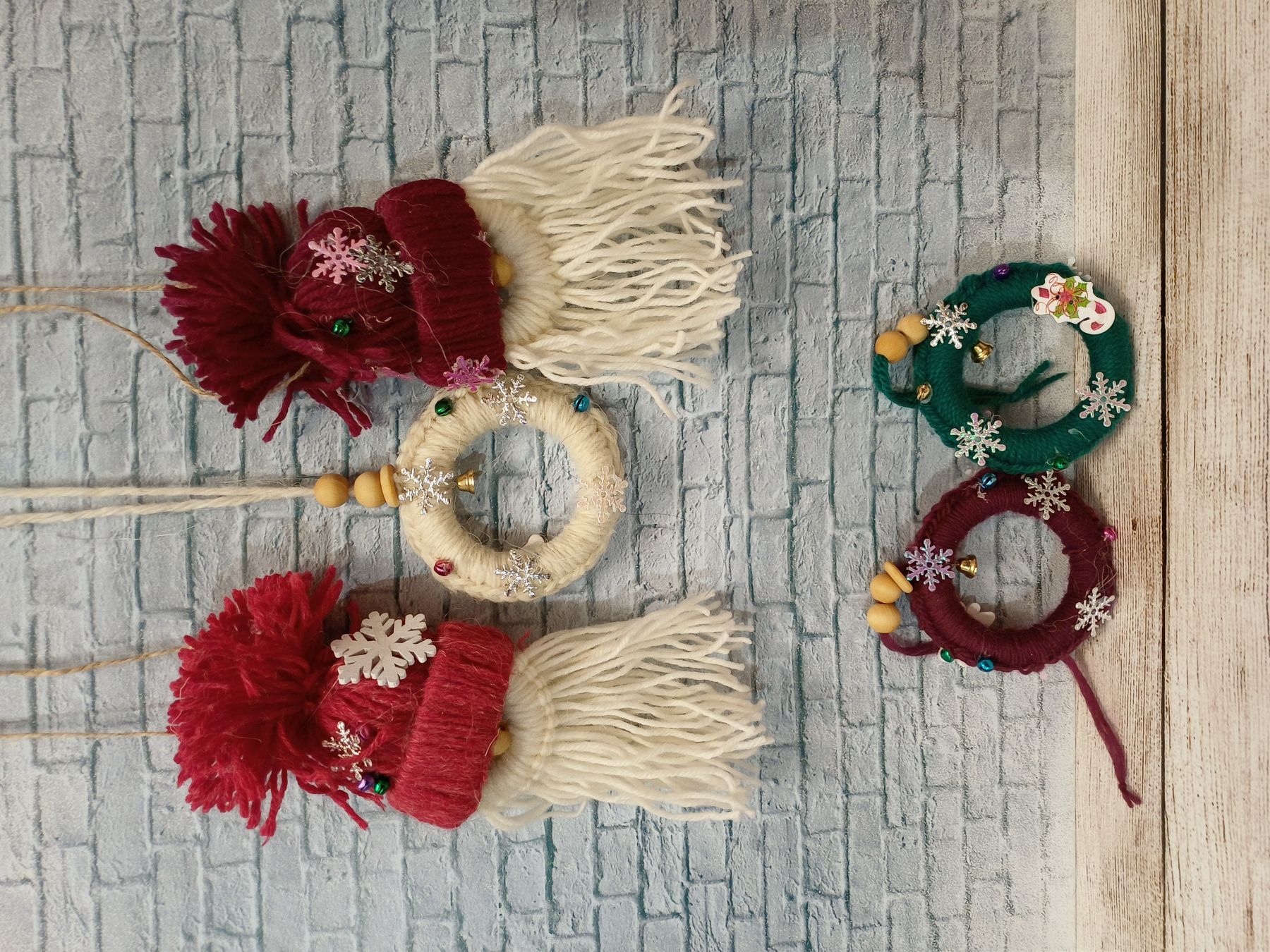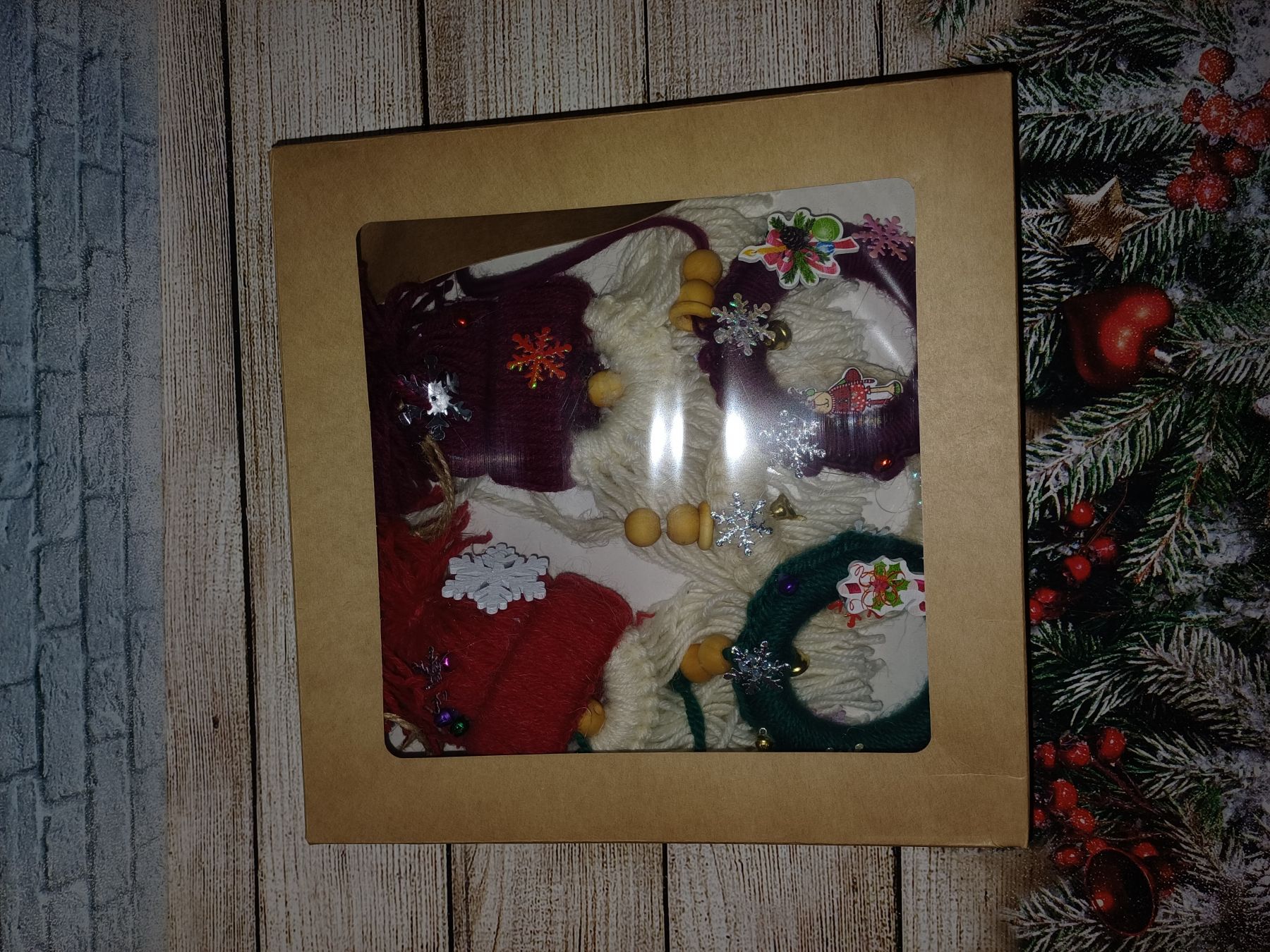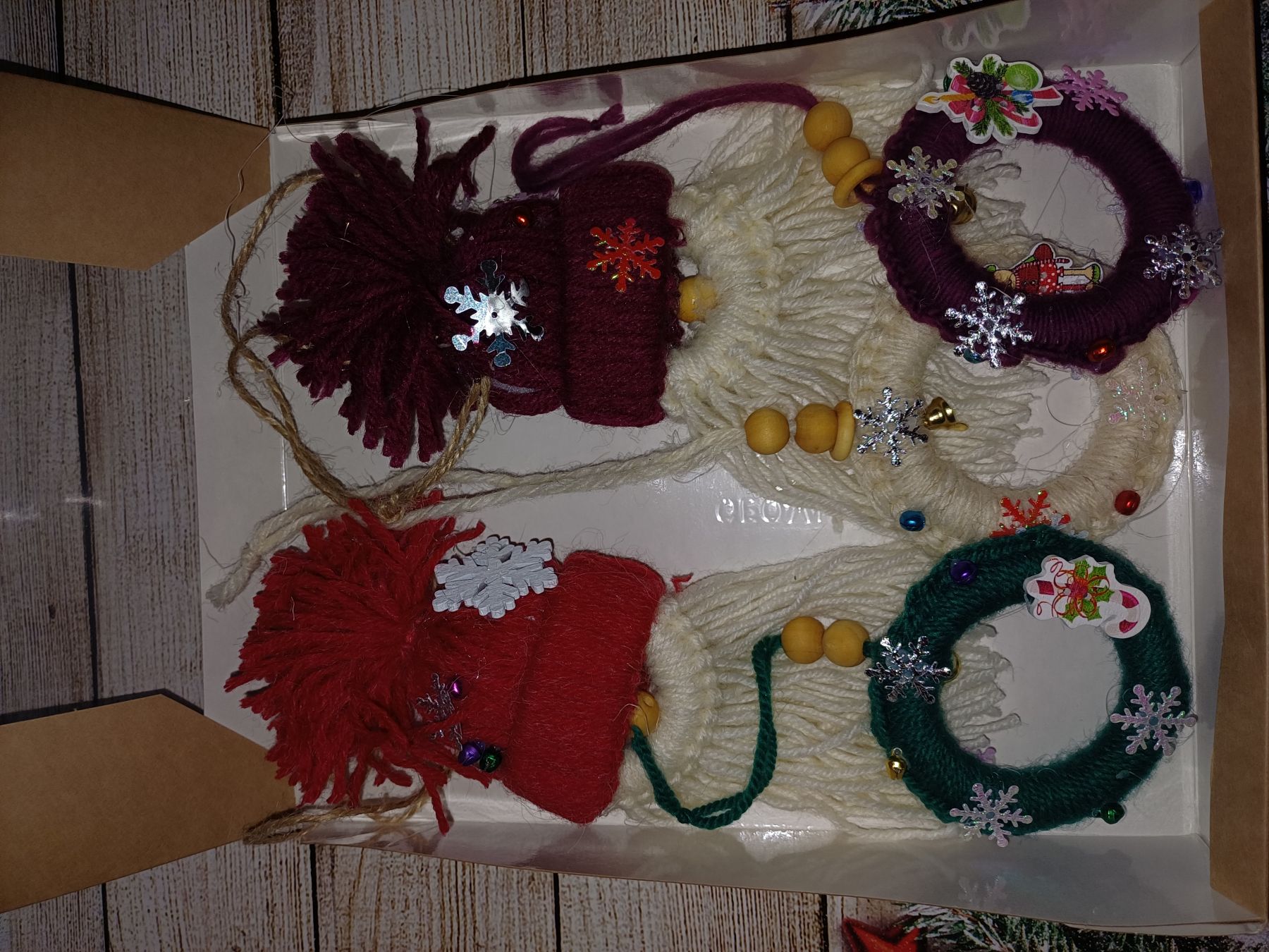 Добавьте нотку тепла и настоящего волшебства в ваш праздничный декор! Этот эксклюзивный набор мягких игрушек создан, чтобы дарить уют. Очаровательные гномики в шапочках и миниатюрные рождественские веночки выполнены вручную с любовью к каждой детали. В отличие от холодных стеклянных шаров, эти украшения хочется трогать и рассматривать. Пушистые бороды гномов, фактурная пряжа, деревянные бусины и блеск снежинок создают неповторимую атмосферу домашнего праздника. В наборе: 2 Очаровательных гнома: Хранители домашнего очага в красном и бордовом колпачках с пушистыми помпонами. 3 Праздничных веночка: В классических рождественских цветах (изумрудный, молочный, винный), украшенные звонкими бубенчиками и тематическим декором. Почему этот набор особенный: