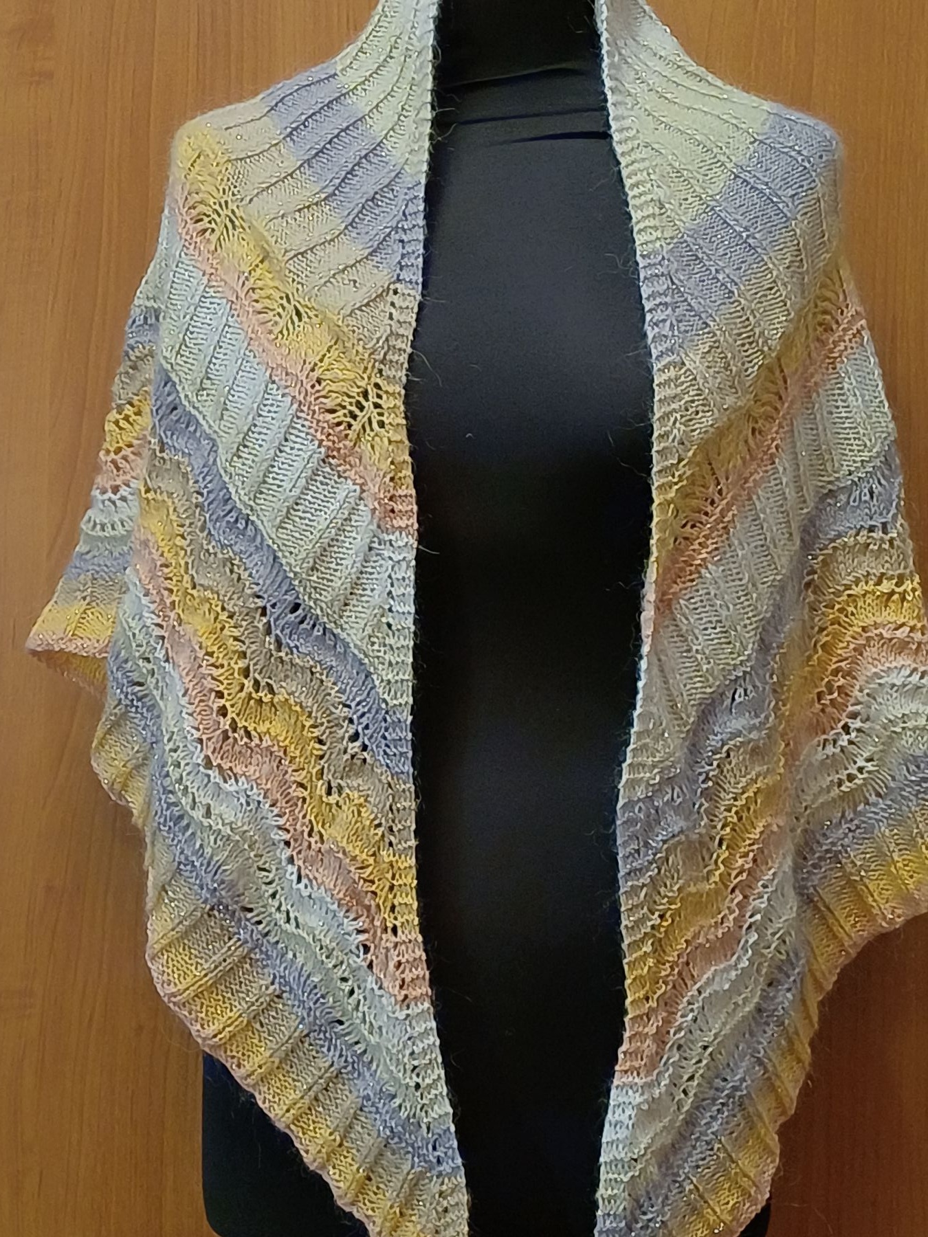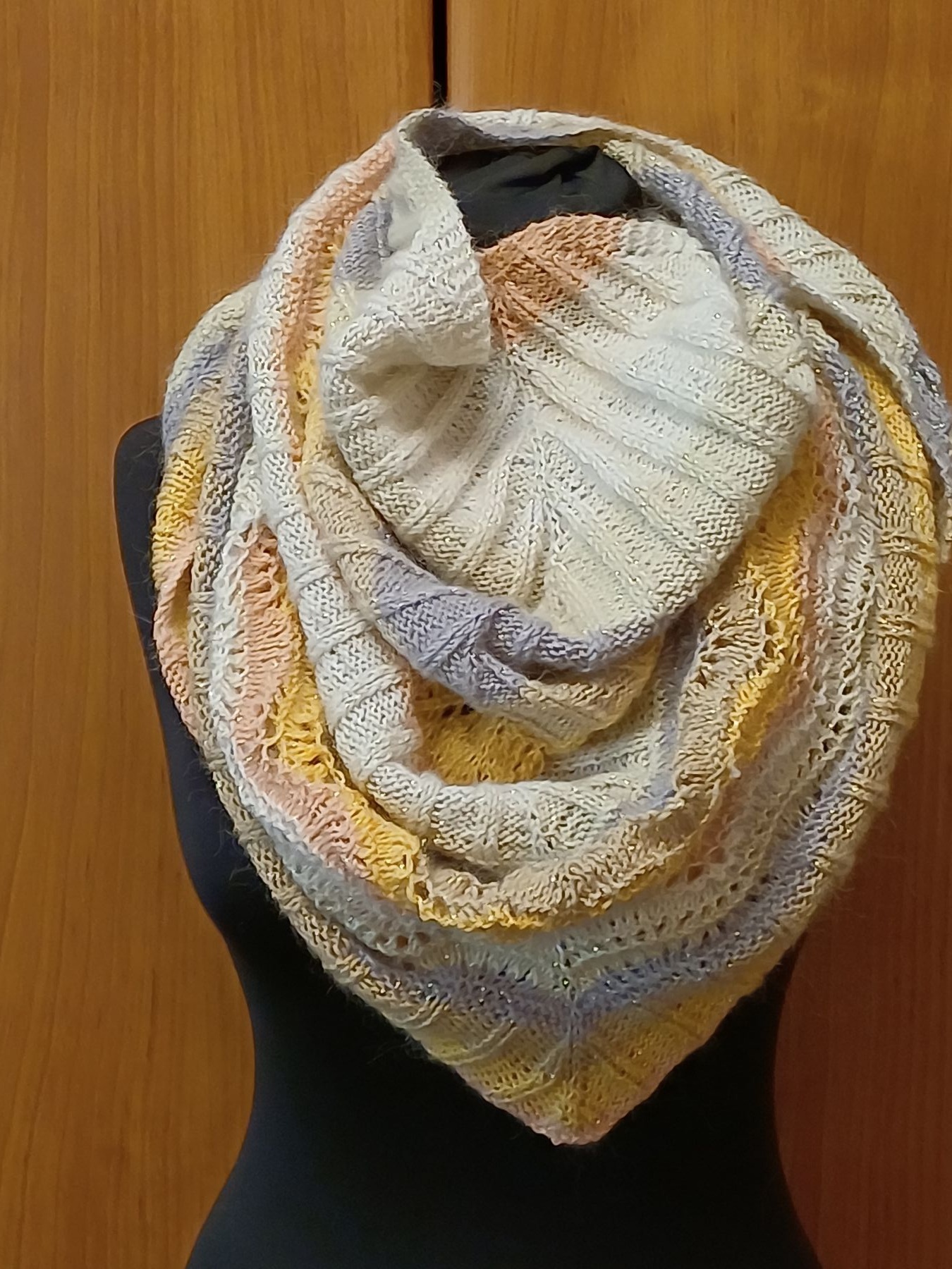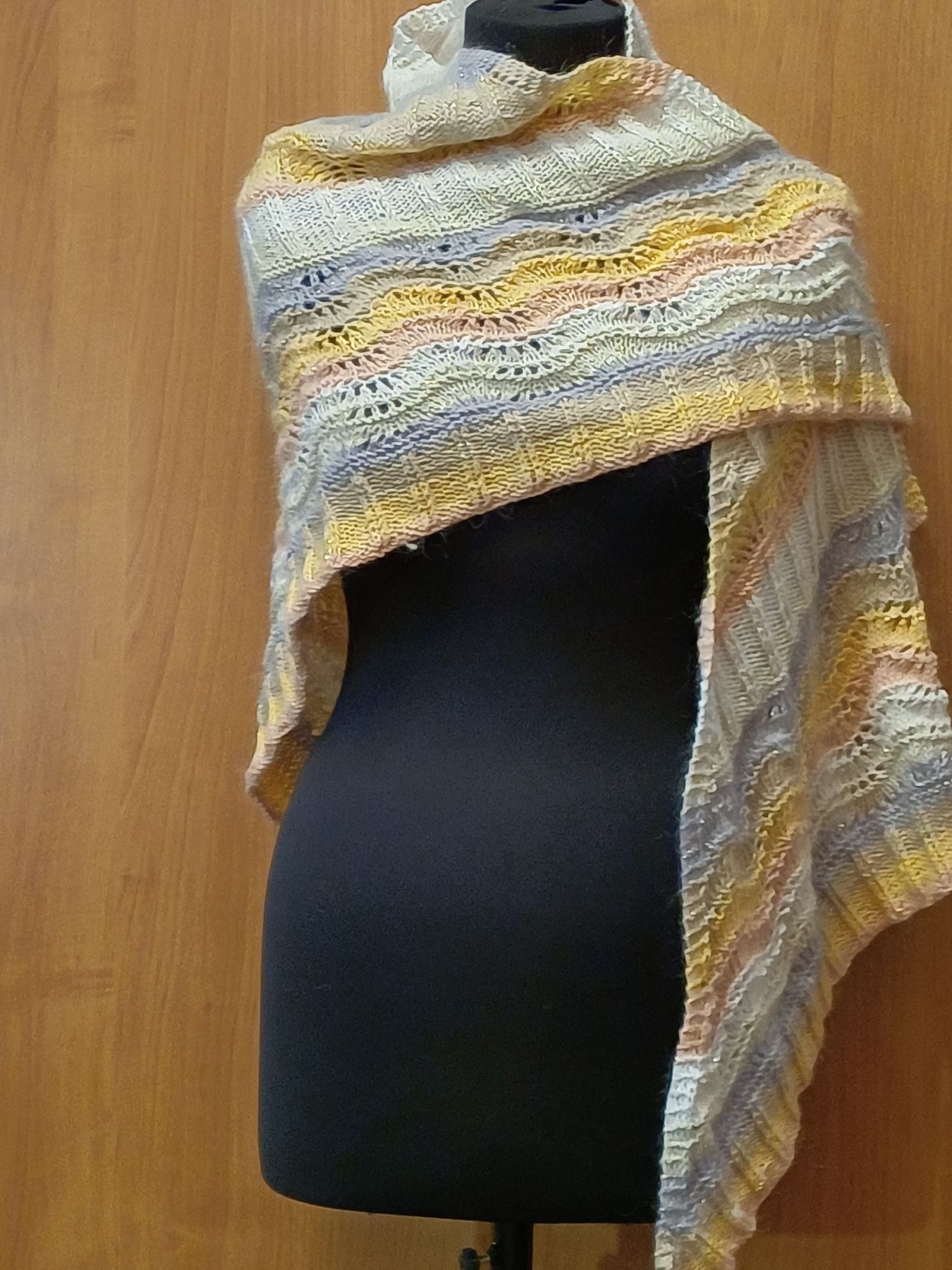 Плавные переходы цвета от солнечного-желтого и персикового до благородного серого создают неповторимый рисунок, напоминающий о первых лучах рассвета. Сложный ажурный узор чередуется с классической платочной вязкой, придавая изделию фактурность и легкость.