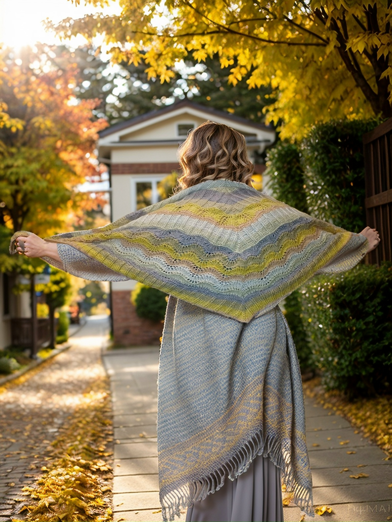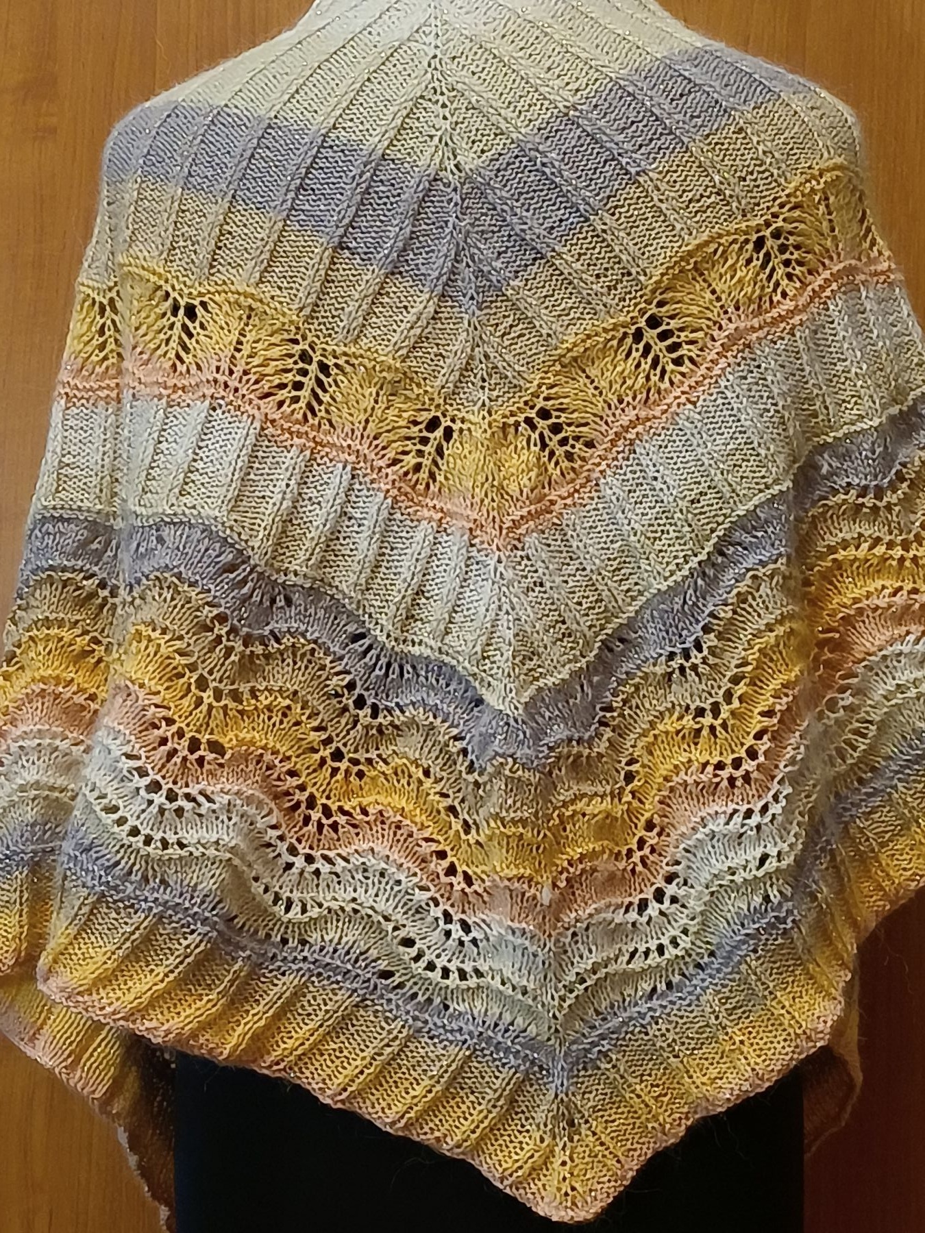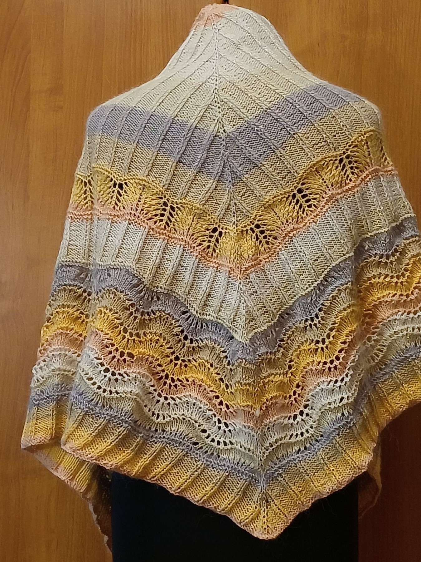 Плавные переходы цвета от солнечного-желтого и персикового до благородного серого создают неповторимый рисунок, напоминающий о первых лучах рассвета. Сложный ажурный узор чередуется с классической платочной вязкой, придавая изделию фактурность и легкость.